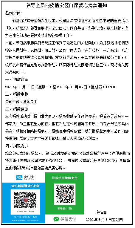 3月2日特力康響應以習近平同志為核心的黨中央的號召,號召特力康人踴躍向疫情嚴重地區捐款,為奮戰在一線的抗疫醫務人員和因疫情遭受損失的同事及親屬貢獻一份綿薄之力,這也正應征了姜總(董事長)常說的話:“作為一名黨員就應該負起黨員應該承擔的責任和擔當,同樣作為一家公司,應該成為社會這個個體中的一粒有益的細胞,為社會做出積極貢獻,一方有難,八方支援,做到盡我所能,足矣”。